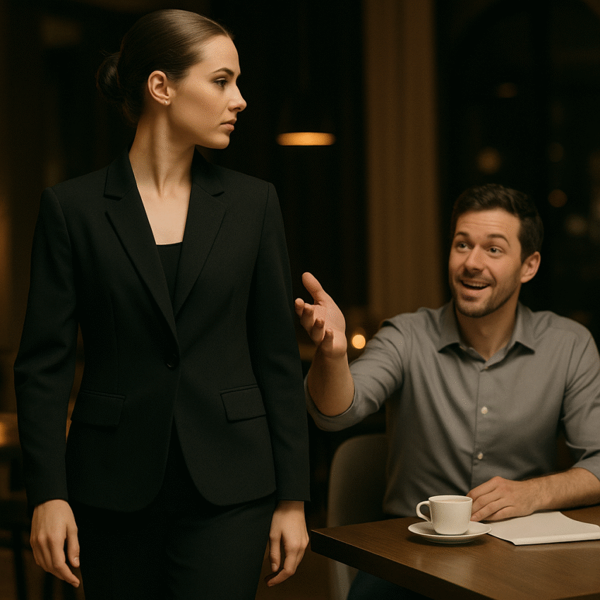 Я немного опаздывала. Надела чёрный брючный костюм — строго, но элегантно. Волосы собрала в пучок, чтобы не лезли в лицо. Это был не мой первый опыт дейтинга, но всё равно сердце стучало громче обычного.